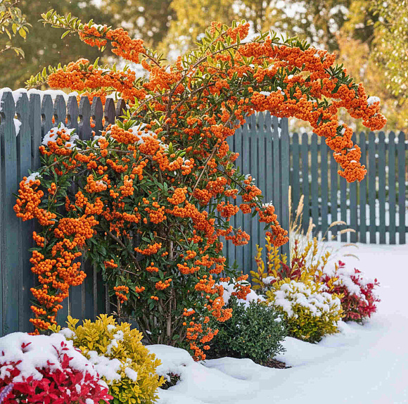 Название «pyracantha» происходит от греческих слов pyros (огонь) и acantha (шип), что переводится как «огненный шип» (или «горящий куст», упоминаемый в Библии). Один из самых декоративных кустарников в зимний период. Форма раскидистая, ветви прямостоячие с блестящей кожистой листвой ярко-зеленого цвета. Если их не обрезать, изящно падают под тяжестью роскошных гроздей оранжево-красных ягод. Их обилие поражает! Они сохраняются на растении до весны. Кустарник удивительно вынослив, не боится ни засухи, ни бедной почвы, ни городских условий выращивания. Создает непроходимую живую изгородь. Зимостойкость до −30 °С.