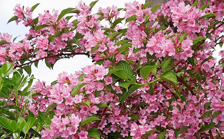 Раскидистый густооблиственный кустарник уже в конце мае покрывается нежнейшими розовыми воронковидными колокольцами. Цветки красиво пониклые, собранные в небольшие пучки, создают неповторимый образ райского сада. Молодые побеги красноватые, листья ярко-зеленые, цельные, по краям мелкозубчатые, слегка опушенные. Осенью куст становится охристо-желтым, не спешит сбрасывать листву, тем самым продлевая период вашего любования и свой срок декоративности.