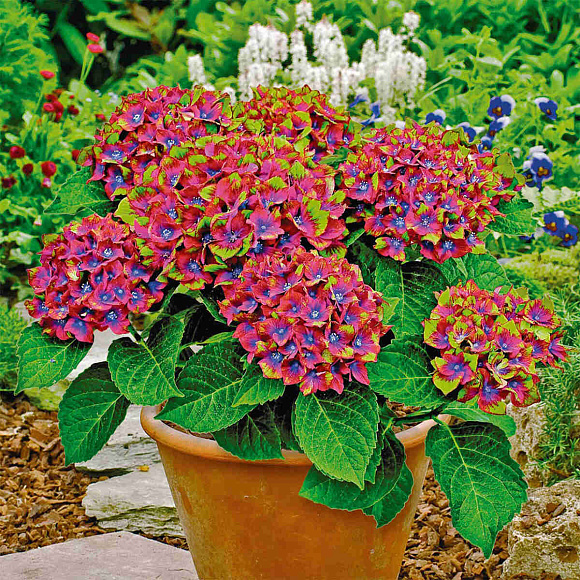 Создавая разную среду (кислотную или щелочную) с разных сторон одного куста, можно добиться одновременного присутствия на одном растении и розовых и голубых цветов.