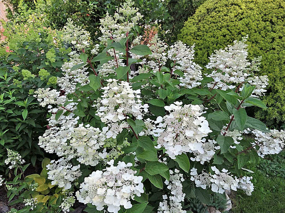 Использую гортензии очень широко. Они отлично смотрятся в любых цветниках как солитер, или в сложных композициях с декоративными кустарниками, и особенно, с хвойниками. Великолепно выглядят при входе в дом или на участок. Сажают гортензии так же в качестве свободнорастущей живой изгороди. Засушенные соцветия долго сохраняют декоративность и используются в зимних букетах.