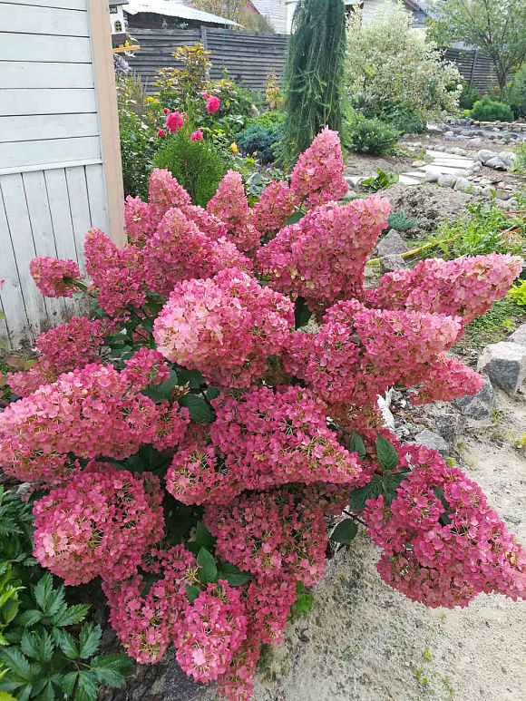 Сандэй фрайз в первые годы своей жизни в моём саду не радовала меня. Цвела рыхлыми небольшими соцветиями - неохотно и лениво, едва распускаясь к концу августа. Прошлой осенью пришлось пересадить - к стене дома, в полутень. И нынче - чудо! Июль только начался, а она уже набрала мощные соцветия, вот-вот начнёт своё великолепное цветение. Уход был классический: частый полив, закисление почвы и жидкая фертика для гортензий каждые десять дней. Да, и зимой мы её укрыли. У нас нынче доходило и до минус 50.