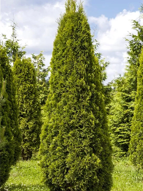 Очаровательная быстрорастущая туя со стойким хвойным ароматом. Один из лучших сортов для создания живой изгороди, которая выглядит очень плотно и однородно. Хвоя чешуйчатая, ярко-зеленая, сохраняет окраску зимой. Крона узкопирамидальная. Очень хорошо переносит обрезку и стрижку (оптимально проводить две стрижки в год – весной и летом). Годовой прирост в высоту составляет 25–30 см. В первый год жизни на зиму рекомендуем укрыть надземную часть и замульчировать приствольный круг щепой или торфом слоем 5–10 см. Минимальное расстояние между растениями для высадки – 50–60 см. Может расти на любой почве. Зимостойкость до −39 °C.