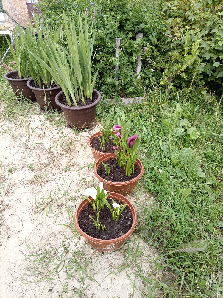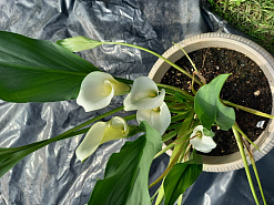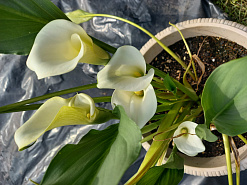 Здравствуйте. Какие красавицы! Спасибо, что поделились фото, - давно ищу белые каллы. Радует соответствие сорту. Я в этом году тоже решила, что им просторнее в открытом грунте, и клубни крупнее, мощнее.