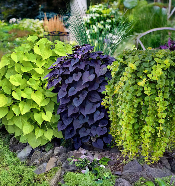 Эффектные крупные сердцевидные матовые листья ипомеи и фактурные монетчатые мерцающие на солнце листья лизимахии объединились в волшебном ампельном наборе. Растения отличаются быстрым ростом, красивыми пышными формами и активным ветвлением. Легки в выращивании. Любят обильный полив. Предназначены для посадки в подвесные кашпо, корзины и контейнеры, а также могут выращиваться как почвопокровники. Великолепные компаньоны для петуний, вербен, калибрахоа, львиного зева, пеларгоний и других красивоцветущих однолетников. Ипомеи зимуют в качестве комнатных растений. Зимостойкость лизимахии до −34 °С.
