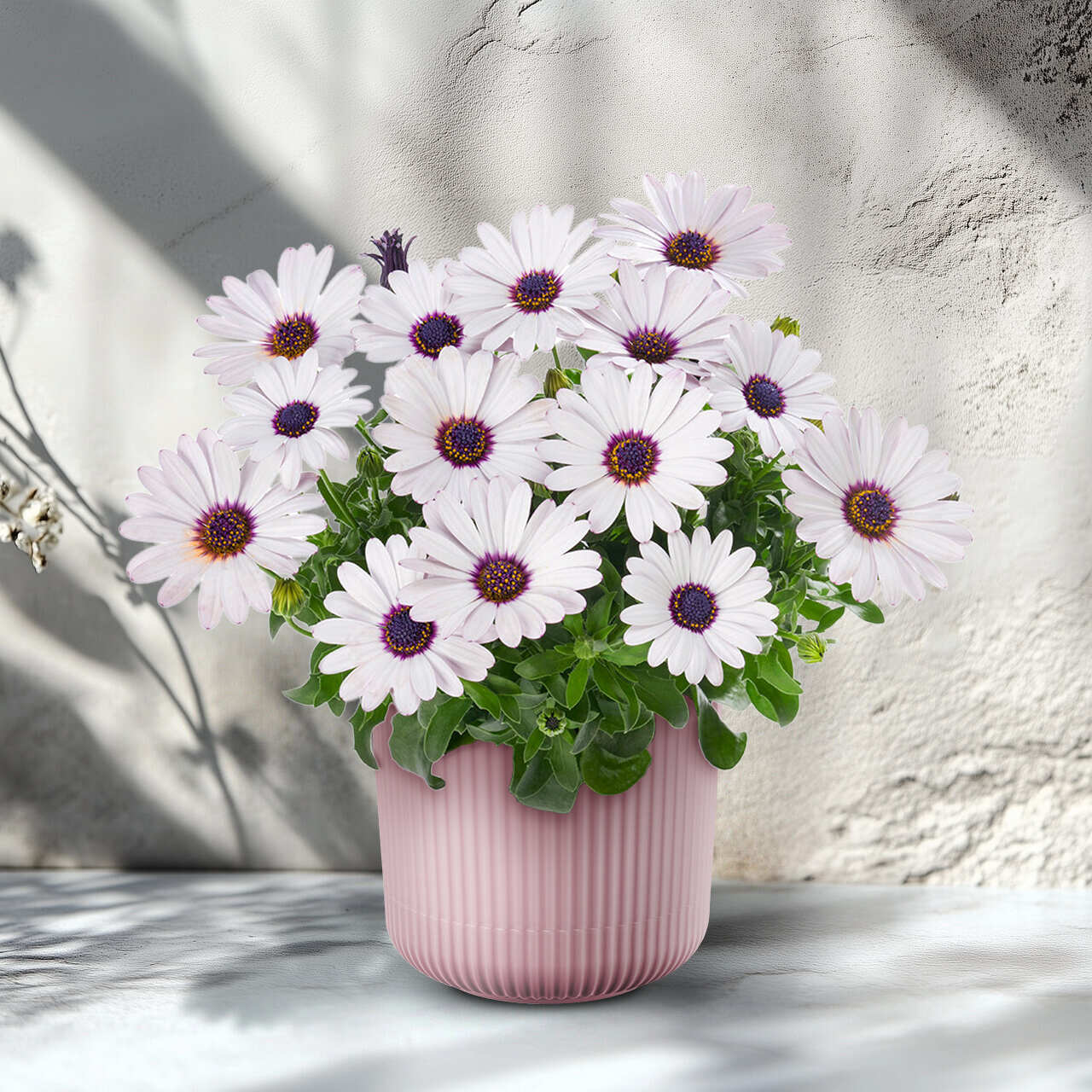 Селекционный прорыв! Потрясающе эффектные компактные крупноцветковые мини-остеоспермумы. Внешне имеют некоторое сходство с ромашками, однако в отличие от последних невероятно обильно цветут большими постоянно обновляющимися цветками 5–6 см в диаметре. За счет плотного, хорошо разветвленного габитуса и жестких побегов кусты отлично держат форму и практически не повреждаются неблагоприятной погодой и вредителями. Цветут без остановки на протяжении всего сезона до самых заморозков. Подходят для выращивания дома и в саду. Рекомендуемый диаметр горшка 10–15 см.