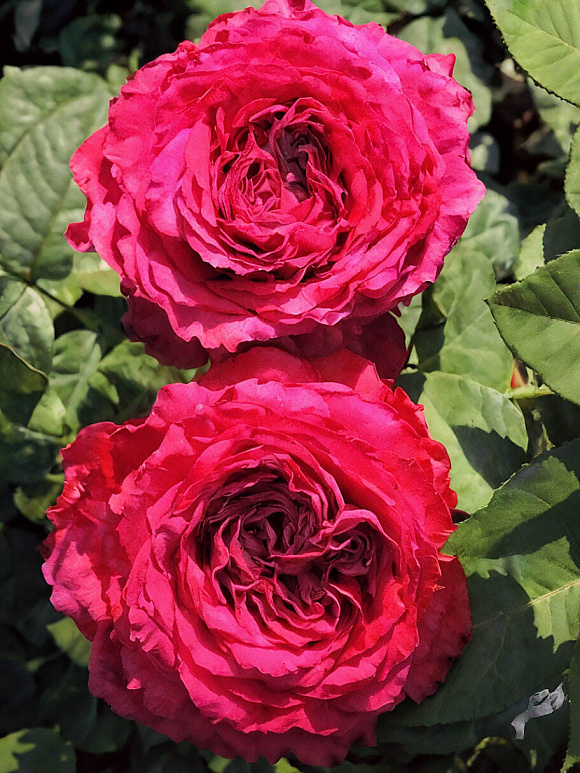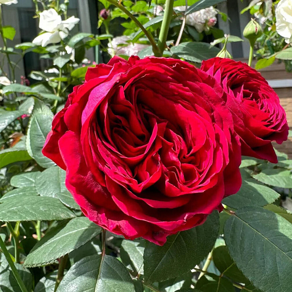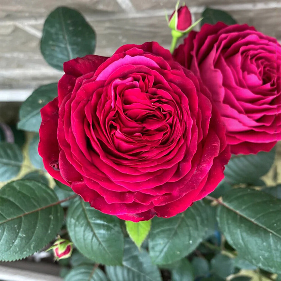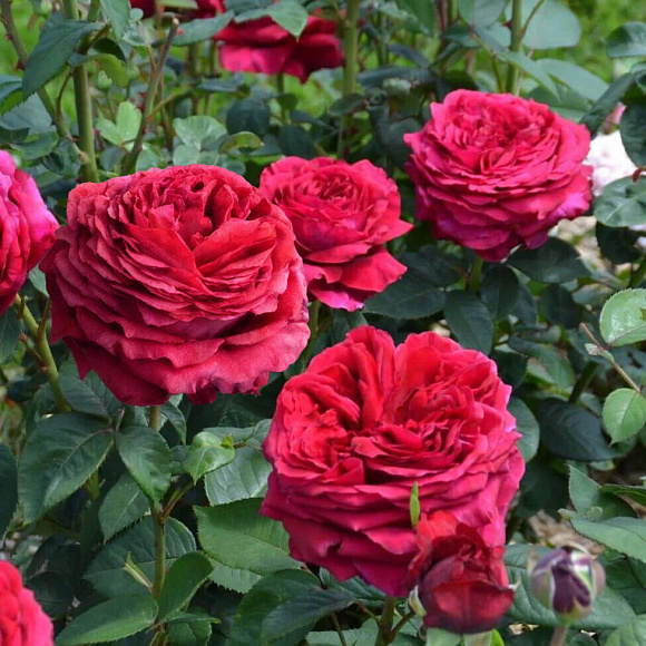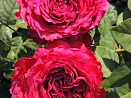 Чудо чудное! Диво дивное! Насыщенного карминного цвета лепестки игриво волнуются и по-особенному красиво в четырех направлениях (как роза ветров) укладываются в огромные цветки, диаметром до 15 см. В каждом бутоне до 100 лепестков! В стадии полного роспуска похожи на пионы. Не выгорают на солнце. Аромат легкий фруктовый с древесными нотками. Сорт устойчив к заболеваниям и морозам. Хорошо держит дождь. Относится к повторноцветущим видам. Обе волны цветения обильные. Зимостойкость до −26 °С.