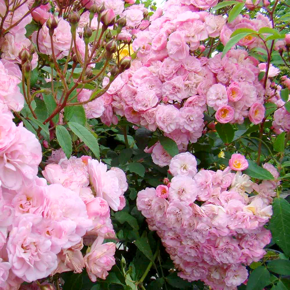 Небесно-розовая нежность! От ее изобилия просто захватывает дух. В период расцвета куст так фонтанирует миниатюрными полумахровыми цветочками, что перекрывает собственную листву. Аромат приятный, слегка уловимый. В композициях не претендует на первые роли, зато на втором плане великолепно вписывается во многие цветовые сценарии. Щедро поделится нарядными веточками для букета, от нее не убудет.