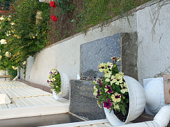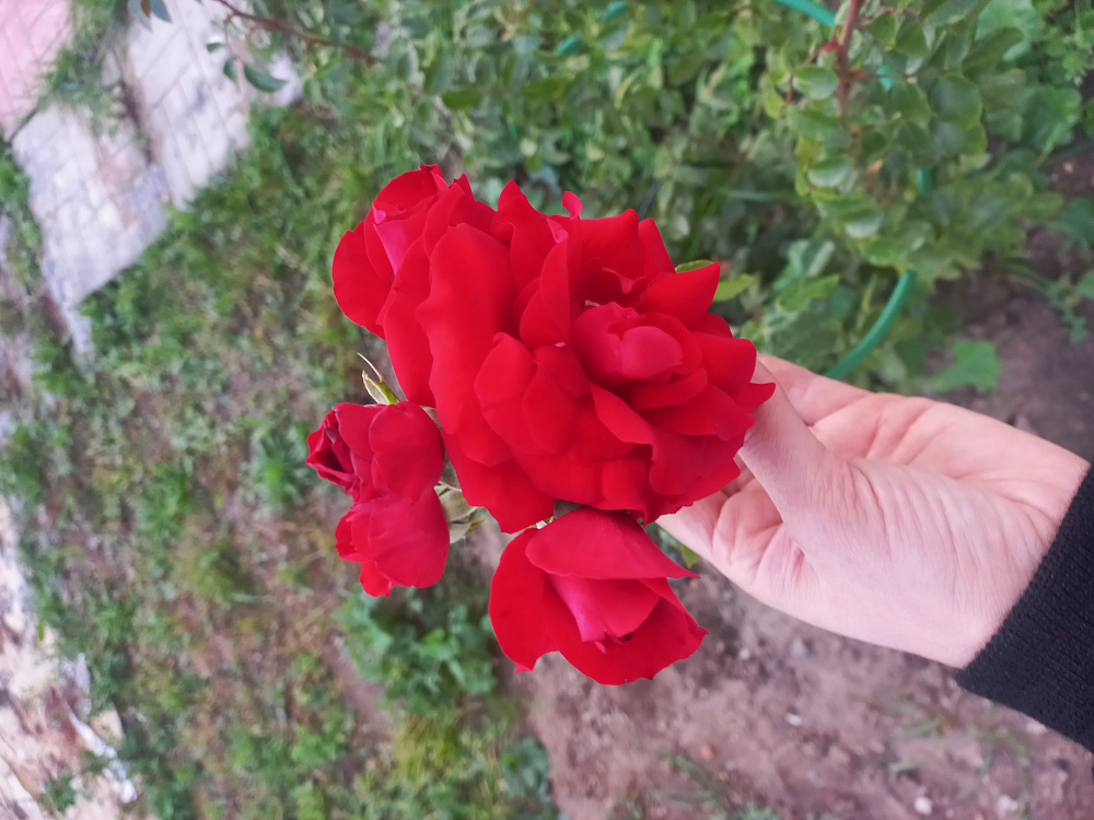 Роза посажена весной 2025 года на южной стороне дома. Сначала надолго задумалась, потом опомнилась, дала несколько уверенных побегов, резво пошла в рост и в конце июля при росте по колено уже бодро цвела (на одном из фото попала в кадр на втором плане и не целиком, т.к. снимались петунии). Крупное фото — повторное цветение на одном побеге, конец сентября. Роза достойная, аромат хорош, средней интенсивности.