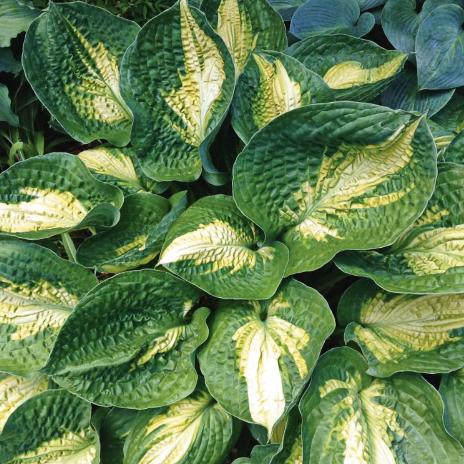 Эффектный солист, акцентирующий на себе внимание. Листья сердцевидной или округлой формы, плотные, кожистые, очень текстурные, вафельно-жатые. По цвету желтовато-салатовые, с широкой сине-зеленой каймой. Цветки белые, колокольчатые. Разрастается полусферой, шириной до 60 см. Высаживают одиночно или группами в композициях.