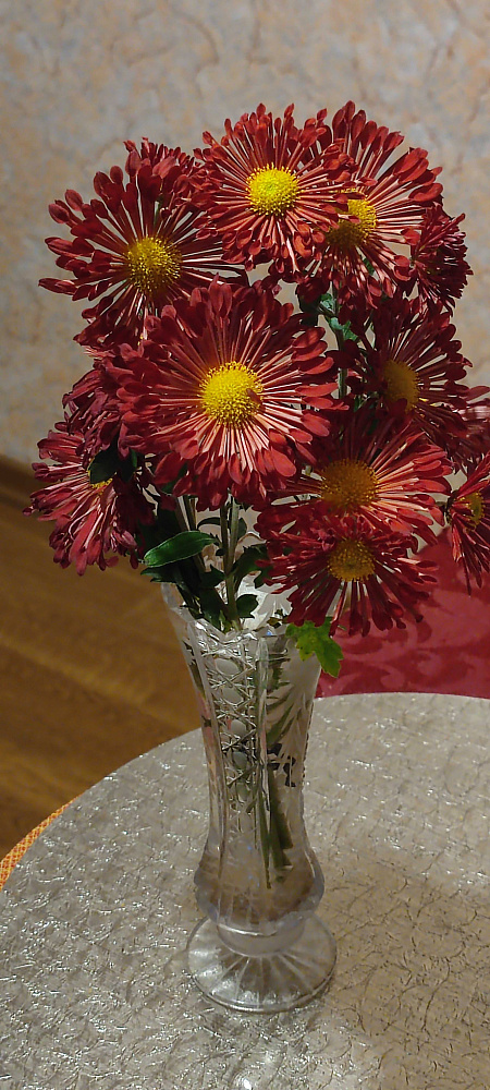 Понравилась хризантема. Расцвела в небольшом затенении. Долго две недели и больше стоит в вазе и распускает бутоны. Немного неустойчива при дожде и ветре.
