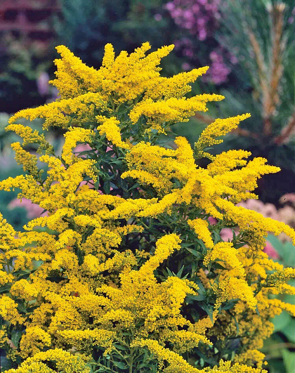 Живописный кустарник с золотисто-желтыми соцветиями, похожими на мимозу, длиной 35 см. Листья ланцетные, поочередные, с зубчатыми краями. Этот золотарник великолепно смотрится в бордюрных композициях, цветниках и клумбах. Прекрасно зарекомендовал себя , как контейнерная культура. Особенно красиво сочетается с другими многолетниками, такими как астильбы, астры, флоксы и декоративные злаки. Золотарник также является лекарственным растением и прекрасным медоносом, привлекая большое количество пчел и бабочек. Садоводы ценят его за простоту ухода, красивое осеннее цветение и способность быстро разрастаться, создавая живописные группы в саду. На зиму рекомендуется срезать всю наземную часть, оставляя 10 см. Лучшее укрытие – снег.
