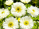 Само совершенство. Цветки махровые, ослепительно-белоснежные, с выразительным чёрным глазком, охваченным в кольцо реснитчатыми золотистыми тычинками.