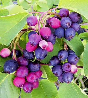 Одни из самых ранних ягод – их можно есть уже в июне. Плоды очень крупные для ирги, массой 1,1 г, диаметром 12-18 мм, чуть продолговатые, с сине-черной кожицей и вкусной, сладкой нежной мякотью, с повышенным содержанием сахара. Плоды созревают почти одновременно. Использование ягод универсальное. Кусты компактные, прямостоячие, 1,5-2 м высотой, нетребовательные к почвам и морозостойкие. Но их надо обязательно спасать от пернатых! Из растений получается великолепная живая изгородь, особенно нарядная осенью, когда листва окрашивается в красно-оранжевые цвета.
