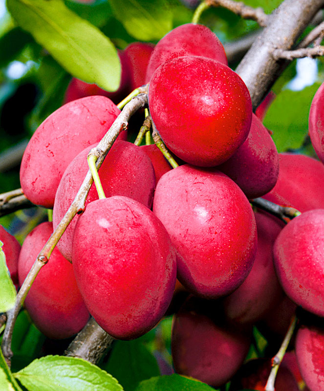 Богатые урожаи каждый год! Яркие крупные плоды массой до 45 г, с насыщенно-красной кожицей, а полностью созревшие — бордовые. Мякоть жёлтая — сочная, ароматная, очень вкусная. Варенье и компоты из этих слив имеют необыкновенно красивый рубиновый цвет. Полностью созревают сливы в конце июля, но можно начать сбор раньше, как только кожица начнёт окрашиваться и они дозреют без потери качества. При перезревании не осыпаются и не растрескиваются. Транспортабельны. Сорт с хорошей морозостойкостью и устойчивостью к основным болезням. Рекомендуемый опылитель – Колонновидная.
