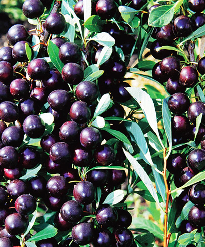 Вишня Бессея (песчаная) — прелестная дюймовочка. Неприхотливая и выносливая микровишня уютно разместится и будет комфортно себя чувствовать везде, куда бы ни забросила ее судьба. Это изящный кустарничек высотой до 1 м с раскидистой кроной и сильнооблиственными прямыми, с возрастом полегающими, иногда стелющимися побегами. Поразительно жизнестойка, одинаково хорошо выносит и сибирские морозы, и знойную засуху. Всегда радует высокой декоративностью и плодовитостью. Восхитительно хороша в период цветения, когда побеги обильно усыпаны мелкими белоснежными цветками, припорошенными ярким бисером карминно-красных тычинок. Летом поражает своим плодородием: побеги плотно облеплены пурпурно-черными шаровидными плодами, не осыпающимися ни при каких условиях и смиренно ждущими заботливой руки хозяина. Удивительно красива осенью, когда серебристо-зеленоватые, удлиненно-овальные, узкие, как у ивы, листья становятся яркими кораллово-красными.