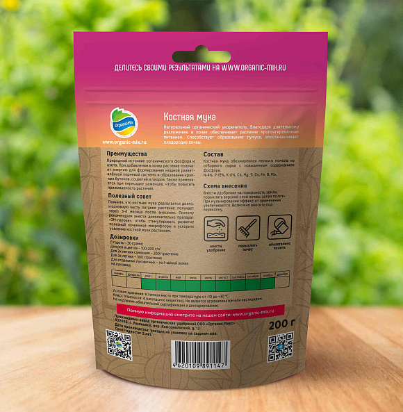 Специально подготовленная для растений костная мука для применения в качестве органического источника фосфора и азота. При внесении в почву, растение получает энергию для формирования мощной разветвленной корневой системы и образования крупных бутонов, соцветий и плодов. Также применяется при пересадке саженцев для быстрого укоренения и развития корневой системы.