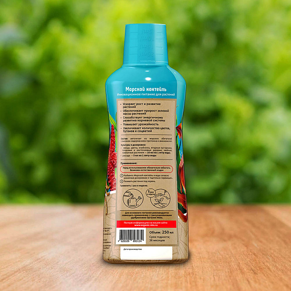 Морской коктейль - это инновационное органическое питание для растений, обеспечивающее их мощнейший рост и развитие, увеличение количества ветвей и толщины стебля, насыщенный зеленый цвет листьев, увеличение количества и размера цветоносов, соцветий и бутонов, повышение урожайности и содержания витаминов и антиоксидантов в плодах.
