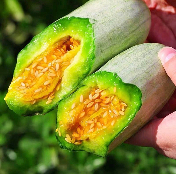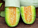 Семена приобрела у вас на сайте.Сажала в 2023году впервые,как диковинку попробовать. Посадка через рассаду в апреле. Посадила в парник к огурцам,так же подвязала и поливала. Растение неприхотливо в уходе. На одном растении завязалось 5 плодов .Очень интересно было когда цвел: каждая завязь была как бы обернута прилежащим листом. Ждали с нетерпением,что же вырастет,когда созреет...Выросли,действительно, удивительные плоды: с виду невзрачные,вытянутые, а на разрезе красивая оранжевая сердцевина с семенами, как на картинке, мякоть нежно зелёная хрустящая,сладкая на вкус и ,действительно ,дынный вкус и аромат! Шкурка очень тонкая.