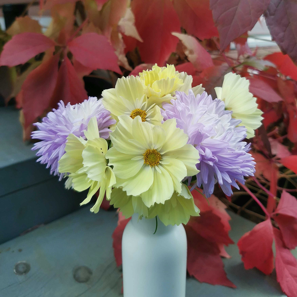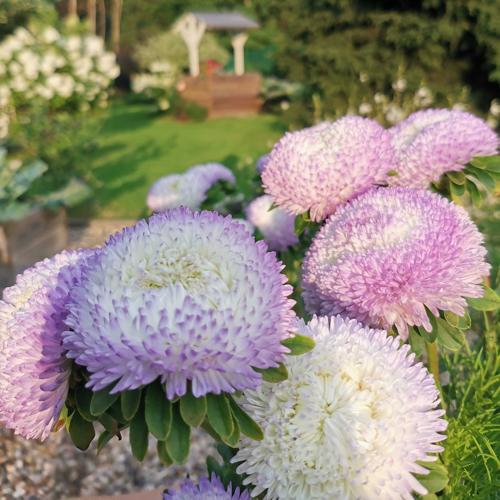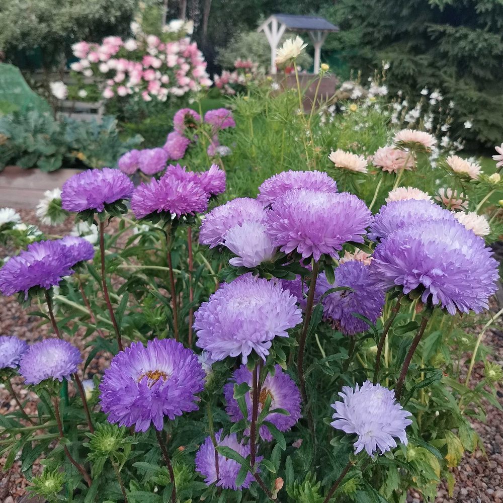 Великолепные цветы! Посеяла в начале марта, всхожесть отличная, в грунт высадила в конце мая. Зацвели в середине июля. В начале цветения нежнятина невозможная светло-сиреневого цвета, набитая, сердцевинки не видно. Далее цвет становится более насыщенный. Цветут ооочень долго, в вазе очень хороши, стоят по две недели, а если в прохладном помещении итого дольше. Куст фотографировала с разницей в три недели. Хороши в сочетании с холодным светло-желтым или салатовым цветом. У меня цвели с космеями.
