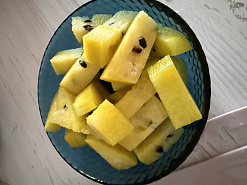 Арбуз 10/10. Форма вытянутого яйца, окрас светло зеленый, кожура тонкая, мякоть желтая, сочная и очень сладкая. Много семян. Выращивала в ХМАО, в теплице, без прививки. Вкус невероятный, это тот арбуз, который хочется обязательно повторить!