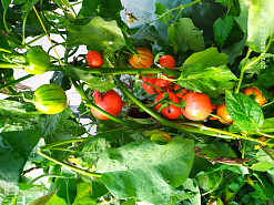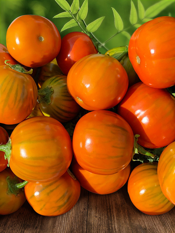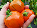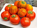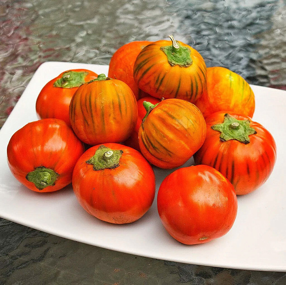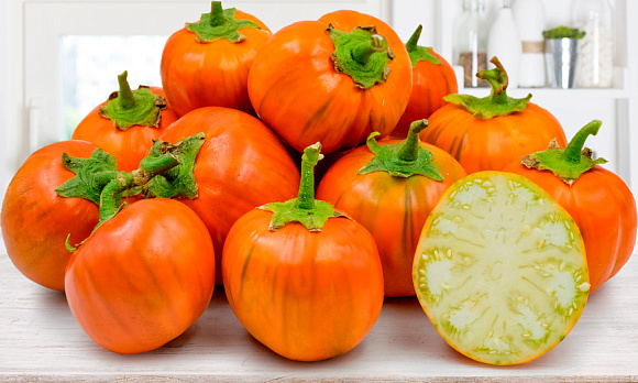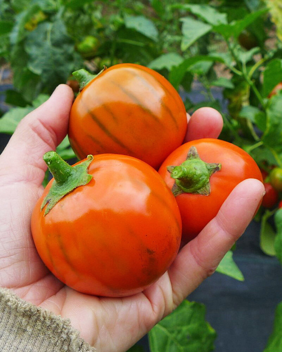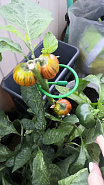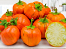 Да-да, он действительно ярко-оранжевый! При этом плоды стандартные, округлые, слегка полосатые, с нежной сладкой мякотью. Отлично подходят для фарширования. Первый урожай — уже в июле. Прекрасно растут в горшках в теплых помещениях, где могут плодоносить круглый год.