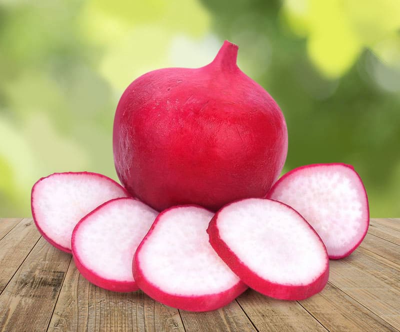 Удивительный гибрид дайкона. Корнеплоды округлые, выровненные, гладкие, насыщенно-бордового цвета, а мякоть белоснежная, однородной структуры, хрустящая, сочная и очень вкусная. Растение с аккуратной ботвой зеленого цвета. Корнеплоды не подвержены растрескиванию, долго хранятся без потери вкуса. Обладает высокой устойчивостью к заболеваниям. Для выращивания в осенний период открытого и закрытого грунта.