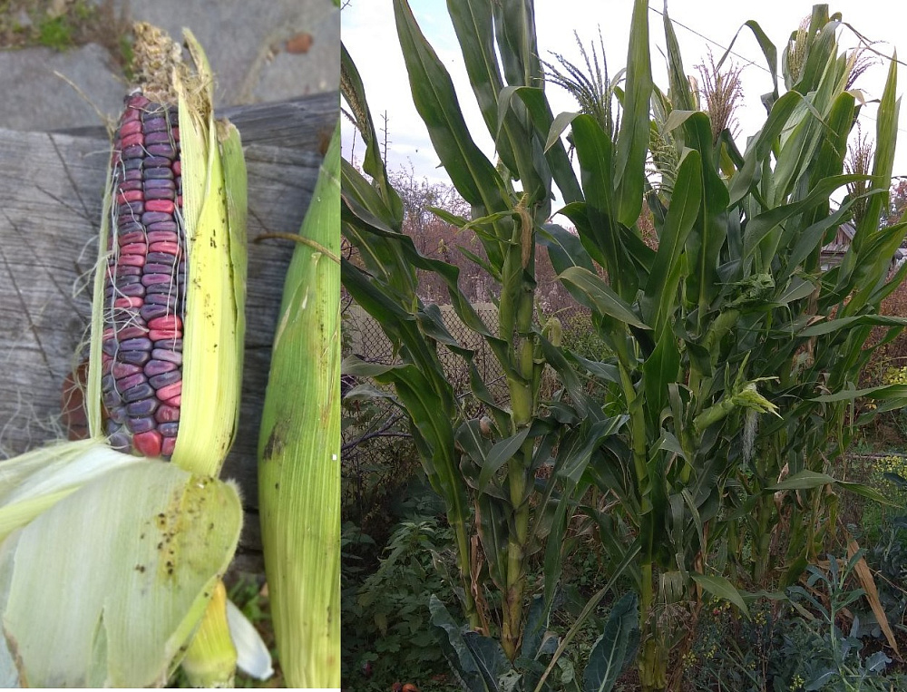Выросла 2,5м высотой, на стебле по 4 початка и на пасынках по два, а в описании сорта высота 1,7м всего. Вкус с небольшой горчинкой. Рядом с капустой росла, поливали часто, может поэтому такая вымахала. К началу октября только на одном стебле из пяти вызрела, а сажал в начале мая через рассаду, получается не 70 дней нужно, 150 не хватило. На фото 7.10.2023г. и ещё цветёт. Кукуруза Спирит на 2 месяца раньше вызрела.