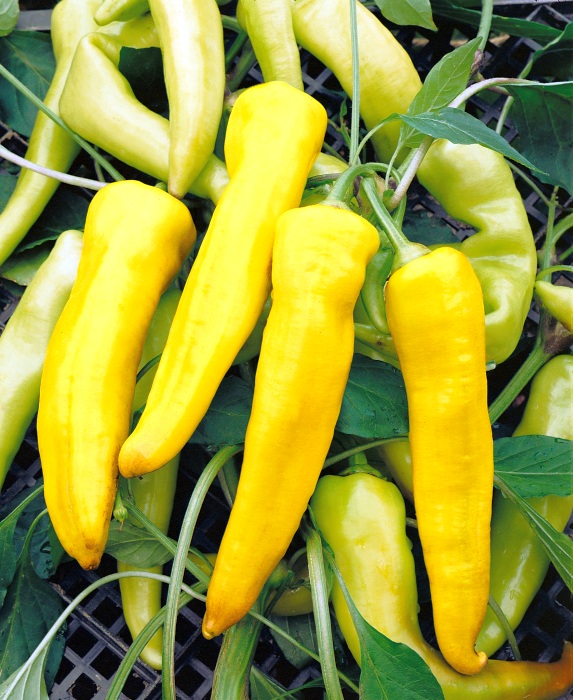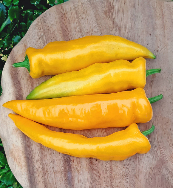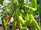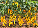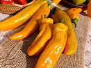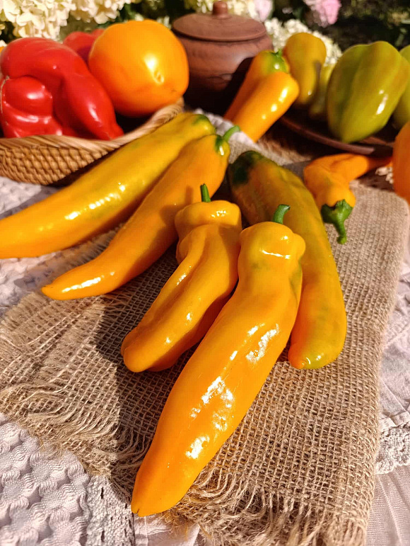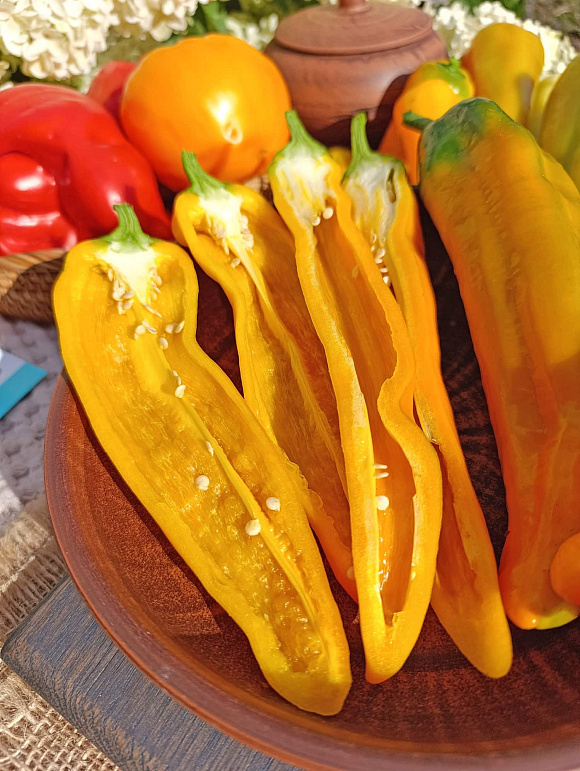 Золотые стрелы амура. Дружно «выстреливает» насыщенно-желтыми, удлиненно-коническими, глянцевыми плодами длиной 22–24 см и диаметром 5–6 см. На одном растении завязывается до 10 плодов. Сладких, очень сочных, с характерным перечным ароматом. Растение компактное, формировки не требует. Сорт среднеспелый, неприхотливый. Устойчив к вирусу табачной мозаики.