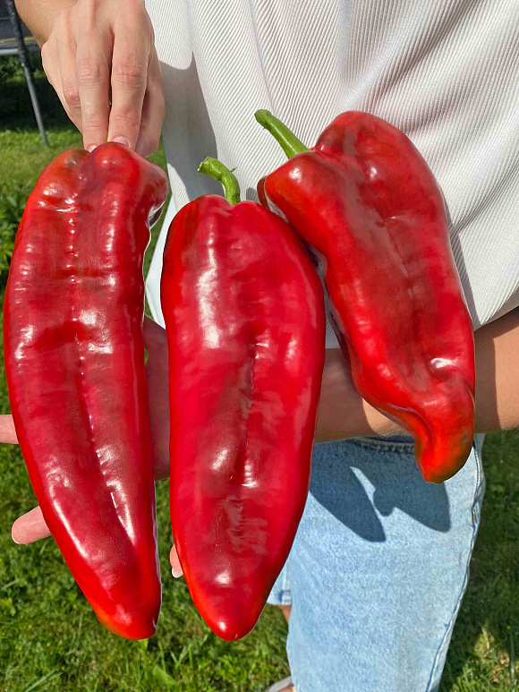 Замечательный, красивейший перец! От других перцев такой формы отличается тем, что поверхностная шкурка не глянцевая, а очень нежная.Плод большой,очень сочный и вкусный,для употребления в свежем виде- отличный вариант.Меня просто поразил большой куст и множество плодов на нём.Сажала на высокой грядке в теплице,получила две волны урожая.