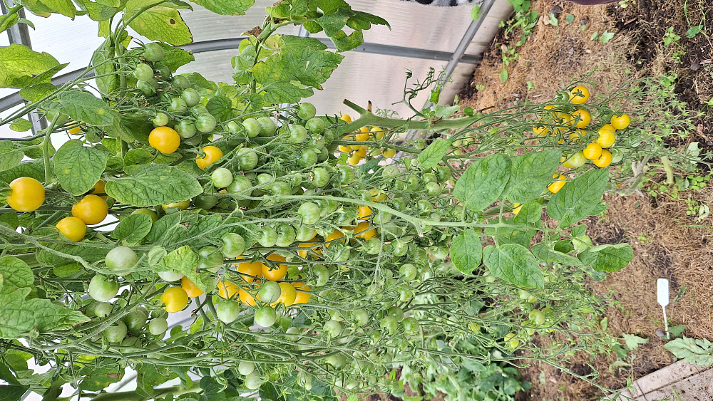 В салаты у нас этот томат не успевает попасть, в основном съедаем сразу с куста и в прикуску как конфетку. Выращивала 2 года по 2 куста и на будущее не откажусь. Фото сделано в сентябре, когда теплица почти пустая.