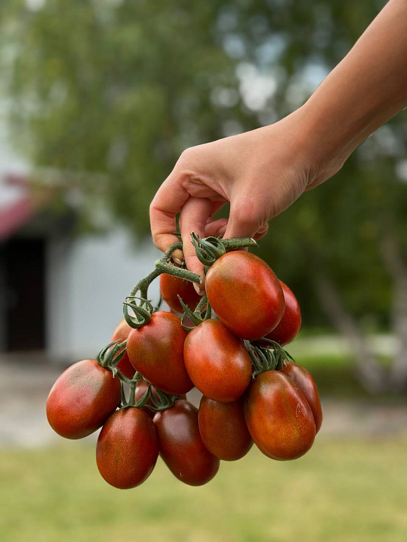 Отличное качество  семян - всхожесть показали 100-процентную. Урожайность хорошая. Куст с созревающими кистями плодов великолепен! Залюбуешься!  Вкусные плоды. Но у нас почему-то не  черно-красные, как на, фотографии, а просто насыщенно-красные, к терракотовым оттенками. Интересно, это норма или пересорт?