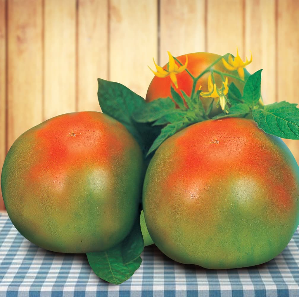 Помидор, которым легко удивить. Плоды, даже когда они созрели, сохраняют зеленоватый окрас. А если их разрезать, то окажется, что мякоть у них насыщенно-красная, а вкус как у розовощеких помидоров - богатый, сладковатый с пикантными нотками. Гибрид индетерминантный имеет высокую устойчивость к нематоде.