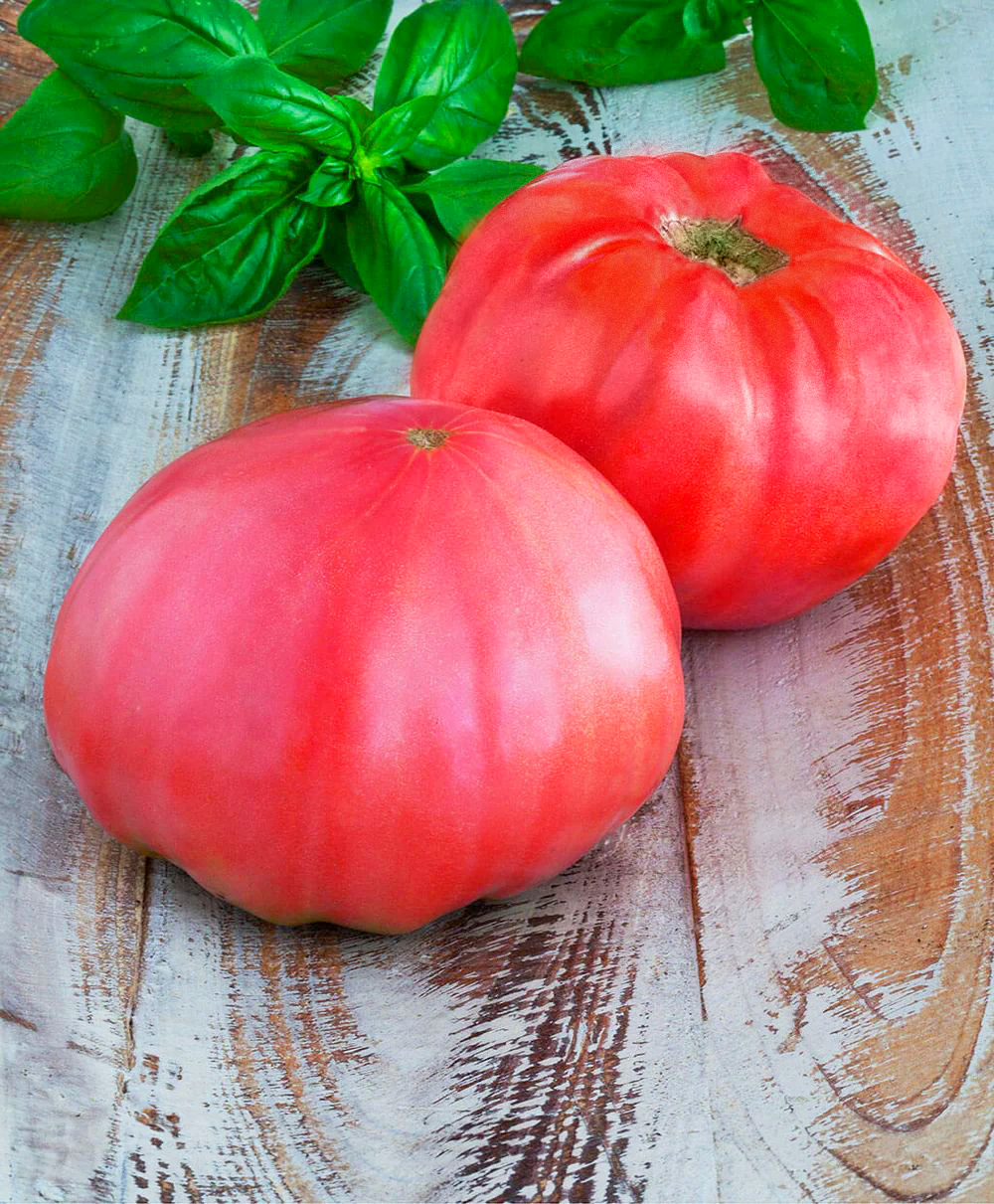 Вкуснейший гигант, наделенный сибирским здоровьем и выраженной сладостью тающей сахарной мякоти огромных помидоров до 15 см (!) в диаметре. Плоды малиновые округло-сердцевидные с ребристыми плечиками. Отлично хранятся. Куст индетерминантный, мощный с большими листьями. Сорт среднеспелый с обильной урожайностью. Формируем в 2 стебля. Пасынкуем как обычно.