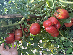 Два года выращиваем этот сорт помидоров, и вкус их просто потрясающий. Они хороши как в свежем виде, так и в салатах или для переработки. В этом году все, кто видел наши кусты, удивлялись, как они выдерживают такую нагрузку. На каждой кисти иногда бывает по четыре, а то и больше помидоров. В итоге у нас получилась огромная гора красных плодов. Одни  из помидоров, который мы решили взвесить, оказались рекордсменами — их вес составил 1950 и 1850 граммов. Это было просто невероятно. До начала октября помидоры не болели, и мы очень довольны этим сортом. Мы живем в южной части страны. У плодов нет жесткой кожицы. Фото я прикрепляю ближе к осени, в конце августа. К этому времени плоды уже были мельче, но мы все равно смогли собрать с одного куста такой объем урожая.