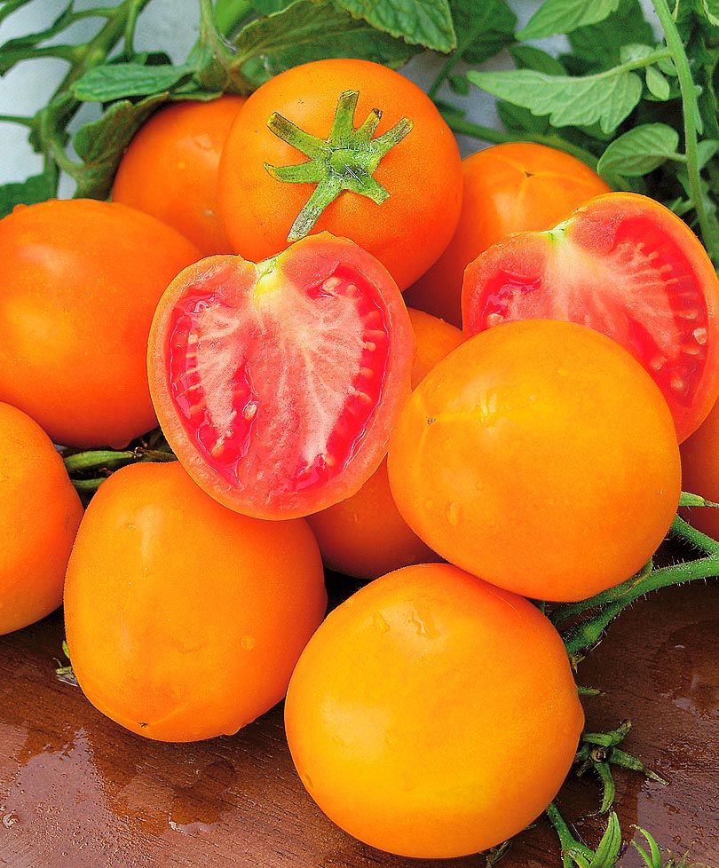 Томат очень оригинальной окраски – жёлто-оранжевый снаружи и при этом красновато-грейпфрутовый внутри. Плоды сочные, вкусные. Томат устойчив к основным болезням, хорошо завязывает плоды при любой погоде. Сорт среднеспелый, индетерминантный. Наибольшая урожайность достигается при формировании в 2-3 стебля, подвязке и пасынковании.
