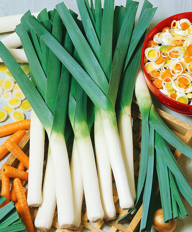 Позднеспелый лук порей убирают пред самыми заморозками. У собранных растений удаляют поврежденные и грязные листья, подрезают корни до длины 1 см и примерно на одну треть листья.