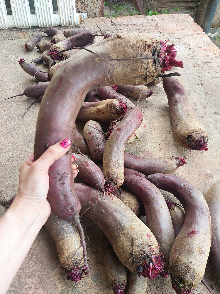 Перед уборкой за сутки грядку хорошо поливают. Свекольную ботву нельзя обламывать руками, это приведет к загниванию ее остатков и спровоцирует рост новой, что оттянет на себя полезные вещества из корнеплода. Ботву необходимо срезать полностью вместе с хвостиком. Корнеплоды очищают от земли, дают 2-3 часа обветриться под навесом или на грядках (если нет дождя, затем рассыпают по чистым полипропиленовым мешкам и сразу же убирают в место хранения. При хранении в ящиках свекла теряет влагу и теряет упругость. Хранят мешки в подвалах или погребах при температуре воздуха при плюсовой температуре 2-4 градуса. У кого в морозильнике есть место, тертую свеклу закладываем на длительное хранение. Оставшийся после переработки урожай до морозов может храниться на лоджии или в гараже.