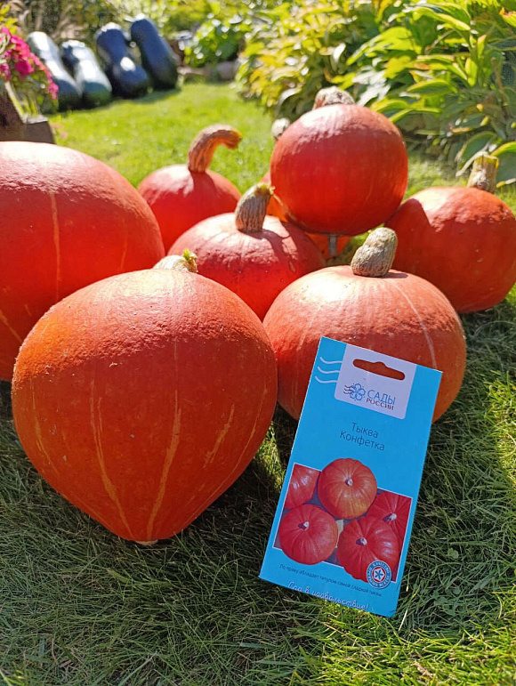 Любимый десерт для маленьких сластён. По праву обладает титулом самой сладкой тыквы среди скороспелых сортов и гибридов. Сочная плотная мякоть и в свежем виде охотно поедается детворой, а уж о запеканках, пюре, кашах и говорить не приходится. Даже самые капризные малыши с первой ложки открывают для себя поистине «райское наслаждение» и в уговорах не нуждаются. Каротин, или провитамин А, заслуженно называют витамином роста. Он улучшает зрение, укрепляет иммунитет, кожу делает гладкой, а кости прочными. Относится к жирорастворимым витаминам, поэтому тыквенную кашу маслом не испортишь, а вот добавление сахара сорту Конфетка не требуется. Хорошо хранится в комнатных условиях на небольшом сквознячке возле балкона или лоджии.