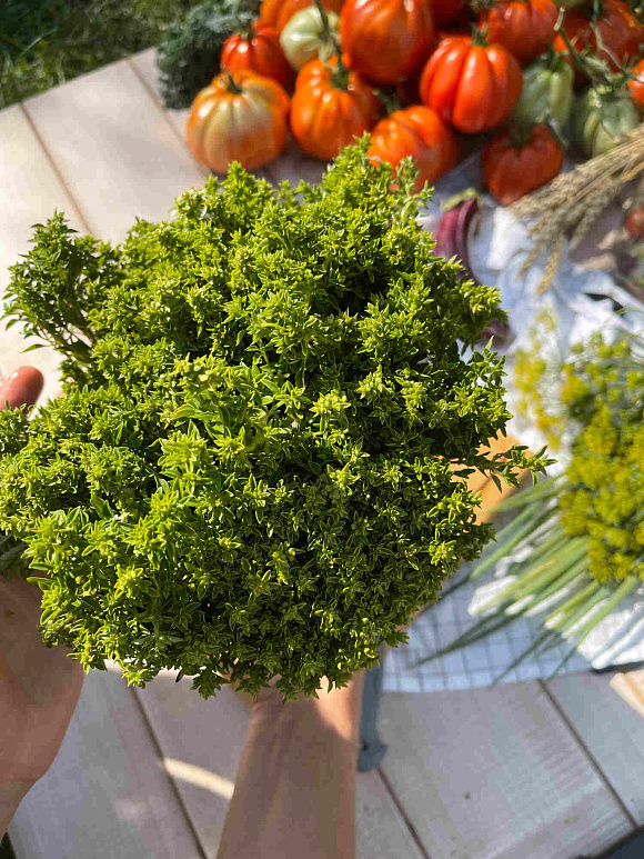 Его кустики настолько пушистые, а листочки настолько мелкие, что напоминают изумрудную россыпь. Удивительно, что это «бисерное»растение способно распространять такой умопомрачительный пряный аромат. Невероятно вкусные и нежные не только листья, но и стебли. А какие можно составить милые летние букетики! Срок созревания ранний.