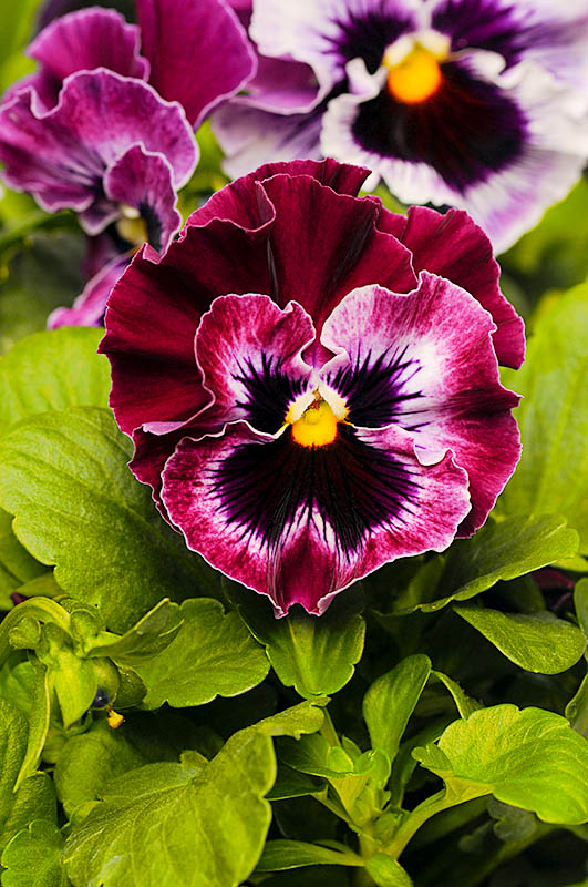 Яркие, необыкновенно выразительные и очаровательные «анютины глазки». Цветки махровые, крупные, до 6—8 см в диаметре, с уникальными гофрированными лепестками, искусно расписанными непревзойдённым по таланту художником — Природой.