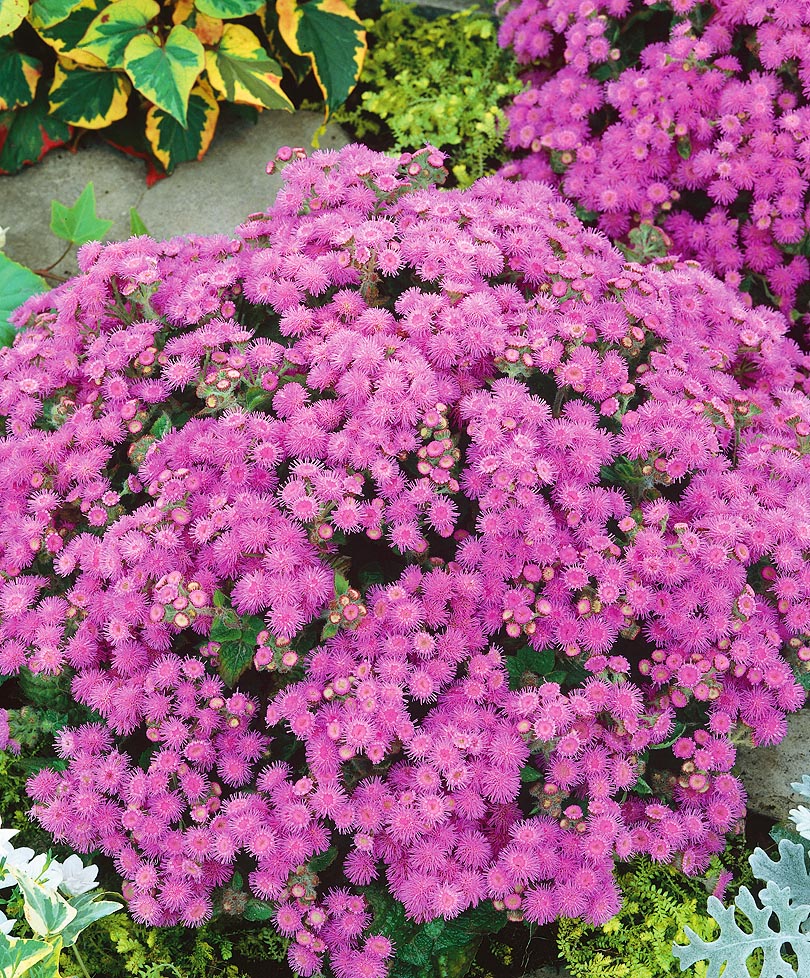 Агератум — растение открытых солнечных мест. Долго сохраняет окраску цветков. Может образовывать сплошные ковры различной окраски. Можно подстричь растения, заодно и подкормить – тогда ковёр станет ещё более пышным.