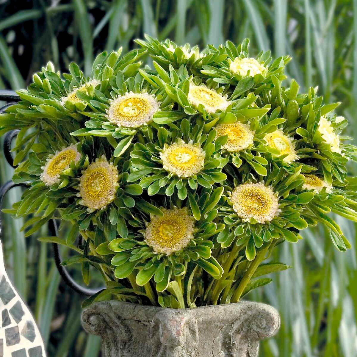 Неповторимый, совершенно уникальный сорт с зелеными цветками без лепестков. Сердцевина двурядная кремового и желтого цветов. Куст хорошо ветвится, цветет очень обильно.