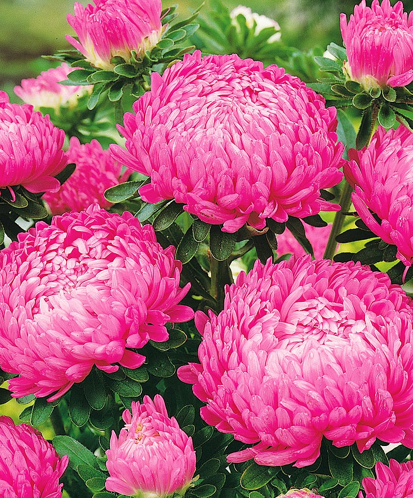 Всем знакомая и всеми любимая классическая садовая астра. Куст колонновидный, с крепкими густооблиственными цветоносами и махровыми шаровидными соцветиями до 10-12 см в диаметре.