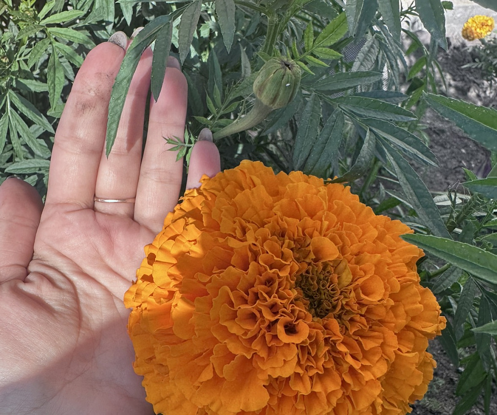 Шикарные бархатцы. Цветы такие огромные, что ломаются под тяжестью цветка.