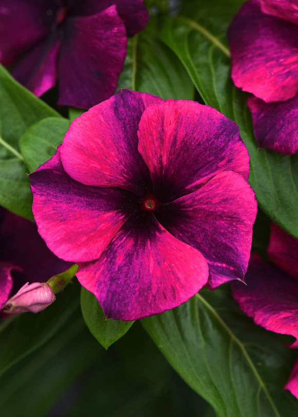 Самая смелая и дерзкая серия барвинков Тату с выразительным контрастом цвета. Темно-фиолетовые вихри Тату Танжерин на сочном мандариновом фоне с сияющим глазком в центре и Тату Черная вишня на малиново-вишневом фоне. Плотное однородное цветение. Предпочтут рассеянный свет.