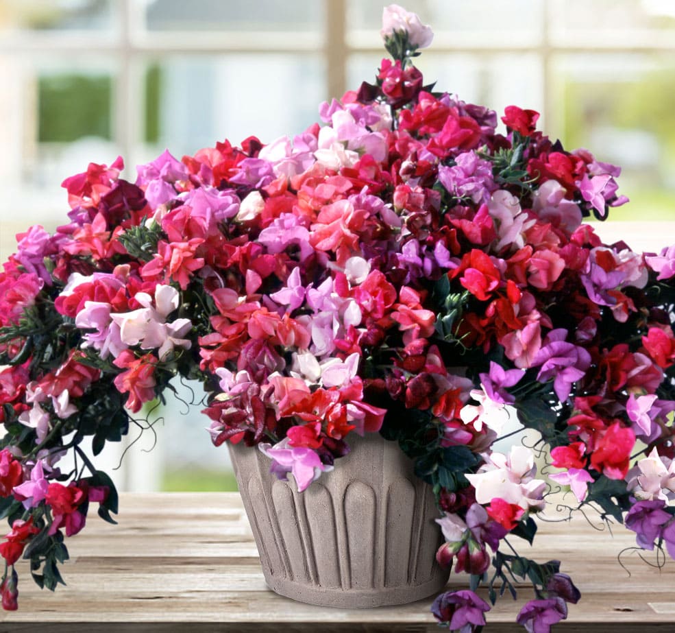 Удивительно чувственный, сочный, очень гармоничный карликовый сорт душистого горошка с волнительными пестрыми и пастельными расцветками. Цветки крупные (до 7 см в диаметре), ароматные, обильно покрывающие куст.