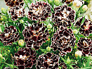 Крупные махровые цветки потрясающе привлекательны контрастной окраской лепестков жгучих до черноты оттенков цвета спелой вишни с тонкой жемчужно-белой каймой по зубчатому краю и такой же белой, как жемчуг, изнанкой.