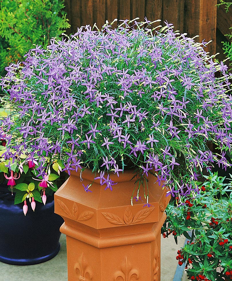 Миниатюрная планета, окружённая сине-лилово-голубым облаком порхающих, как мотыльки, звездчатых цветков. Быстроразрастающийся сорт, идеален для подвесных кашпо. Кустик сильноветвистый, компактный, шарообразный. Обладает высокой засухоустойчивостью, длительным цветением, без необходимости омолаживания растений.