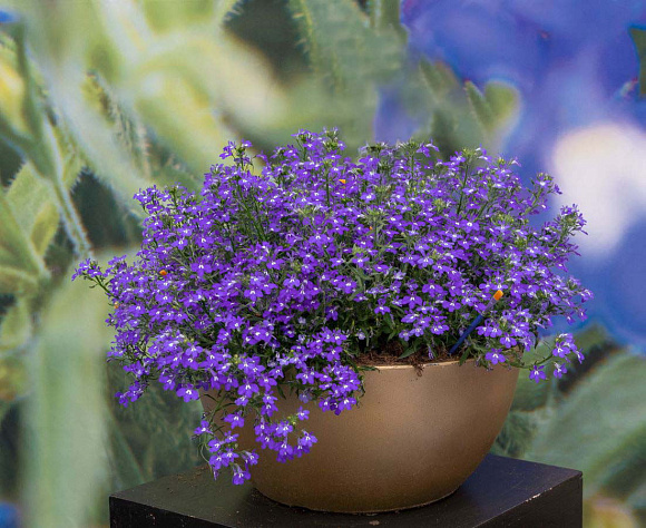 Прорыв в селекции! Золотой призер международных выставок. Первая на рынке гибридная лобелия из семян, которая по обилию цветения и размеру цветков не уступает вегетативным гибридам. Цвет инновационный! Очень рано зацветает крупными ярко-синими цветками с белым глазком. Образует пышные хорошо структурированные кустики холмистого типа. Отлично переносит высокие температуры, великолепно смотрится в подвесных кашпо и на клумбах.