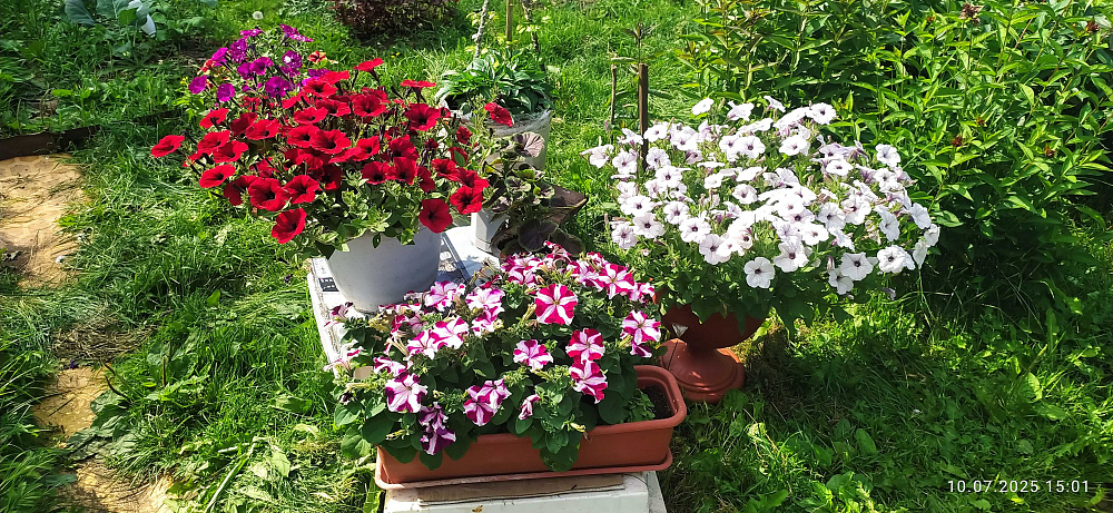 УХОД ЗА ПЕТУНИЕЙ В ГРУНТЕ. Уход за петунией в грунте заключается в регулярных умеренных поливах. В прополках и рыхлении она нуждается до того момента, пока она не заполнит собой сплошным ковром весь отведенный ей участок. Отцветшие цветки нужно своевременно удалять и за сезон несколько раз провести стрижку растений, после каждой стрижки петуния порадует вас вновь обильным кущением и цветением. Подкормки петунии, растущей в грунте в цветниках, нужны раз в 20 -30 дней любым минеральным комплексом для цветочных культур, предпочтительнее кормить по листу. Для петунии в клумбах с ограниченным объемом грунта, например клумба в шине, питание дают раз в 10 -14 дней. Для петуний, высаженных в небольшие кашпо или цветочные горшки, питание дают раз в 7 дней. Объем грунта в цветочном кашпо слишком мал, что бы надолго обеспечить обильное цветение без подкормок. Ампельные петунии любят покушать чаще всех, их кормят раз в 5 дней.